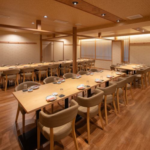 宴会個室がリニューアル!広々快適!34名様までの大型宴会に対応。最大34名様までご利用可能。大人数でも快適なテーブル配置で、料理も会話も楽しめる空間です。会社全体の集まりや大規模な宴会にも最適!
